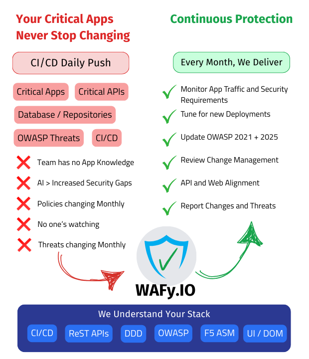WAFy starts by assessing exactly where your ASM/WAF policies are today and building a clear plan to bring them to production-grade standards aligned with the OWASP Top 10 (2021) and Top 10 (2025).